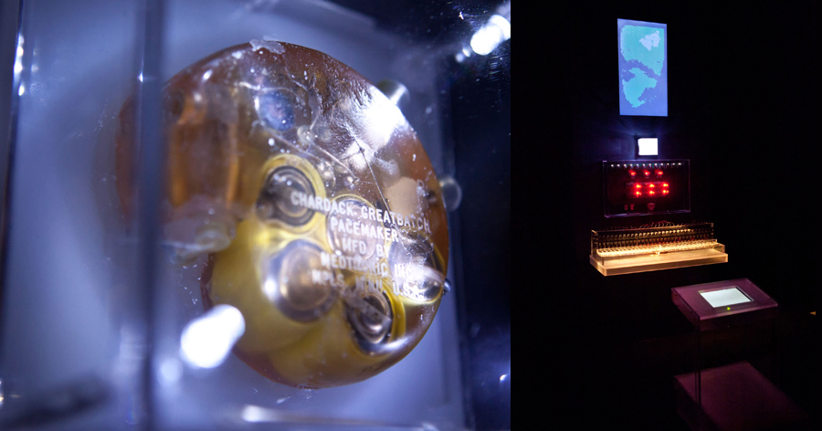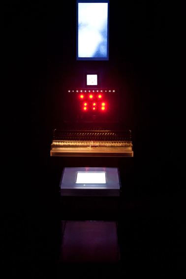 Displayed on a screen, in this sort of "technological altar” images anointed with some kind of mysticism can be inferred, images that may well refer to the Most Sacred Heart of Jesus, accompanied by the surround sound of the heart and breathing rate of a body at rest. Heart beats are accelerated till reaching the typical beats of a pulsing heart, whose frequency will modify the ignition of led sets, thus generating an electronic prototype of “altar”. Through a system of microprocessors, an original pacemaker of the late 60s will be sending pre-programmed signals to a “robot” with 30 metallic arms intended for typing messages which will serve as the spiritual homework habitually recommended by priests to the faithful in the Most Sacred Heart of Jesus Church.